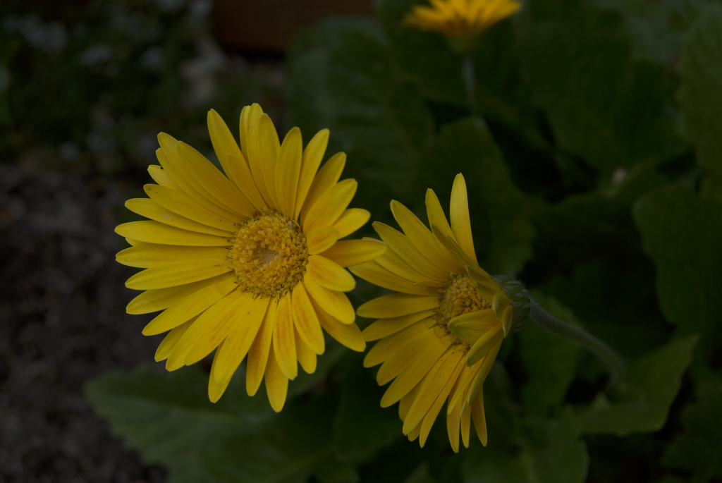Below are some comparative examples. What’s interesting is the first shot is from my D80 and looks underexposed and dark. But looks can be decieving. Because it was shot in RAW format, it contains a ton of data, allowing me to process it in just a couple of minutes into the second image. Because of the exposure settings I used on the Nikon, you can see the rich red patterns on the flower petals. The automatic settings on the Nikon produced rich yellow, but the patterns on the petals were not visible and the green background was less rich.